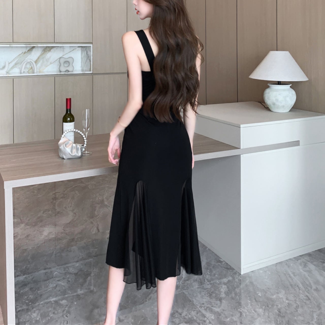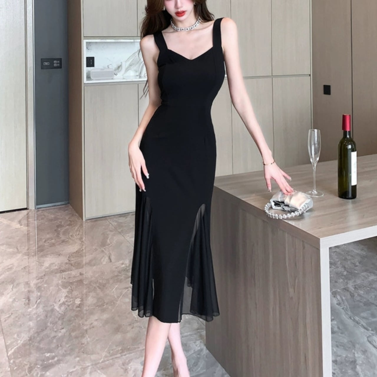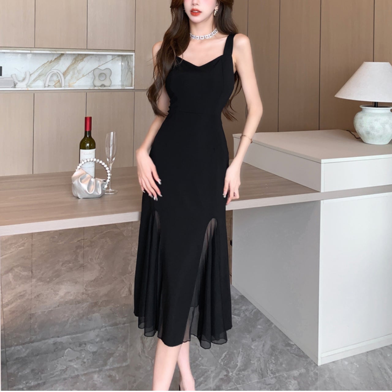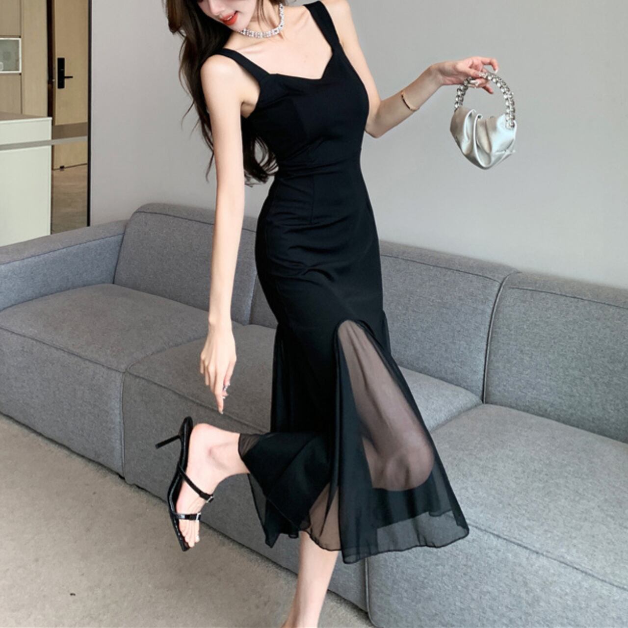 マーメイドライン Vネック シースルー キャミソールワンピース W00025