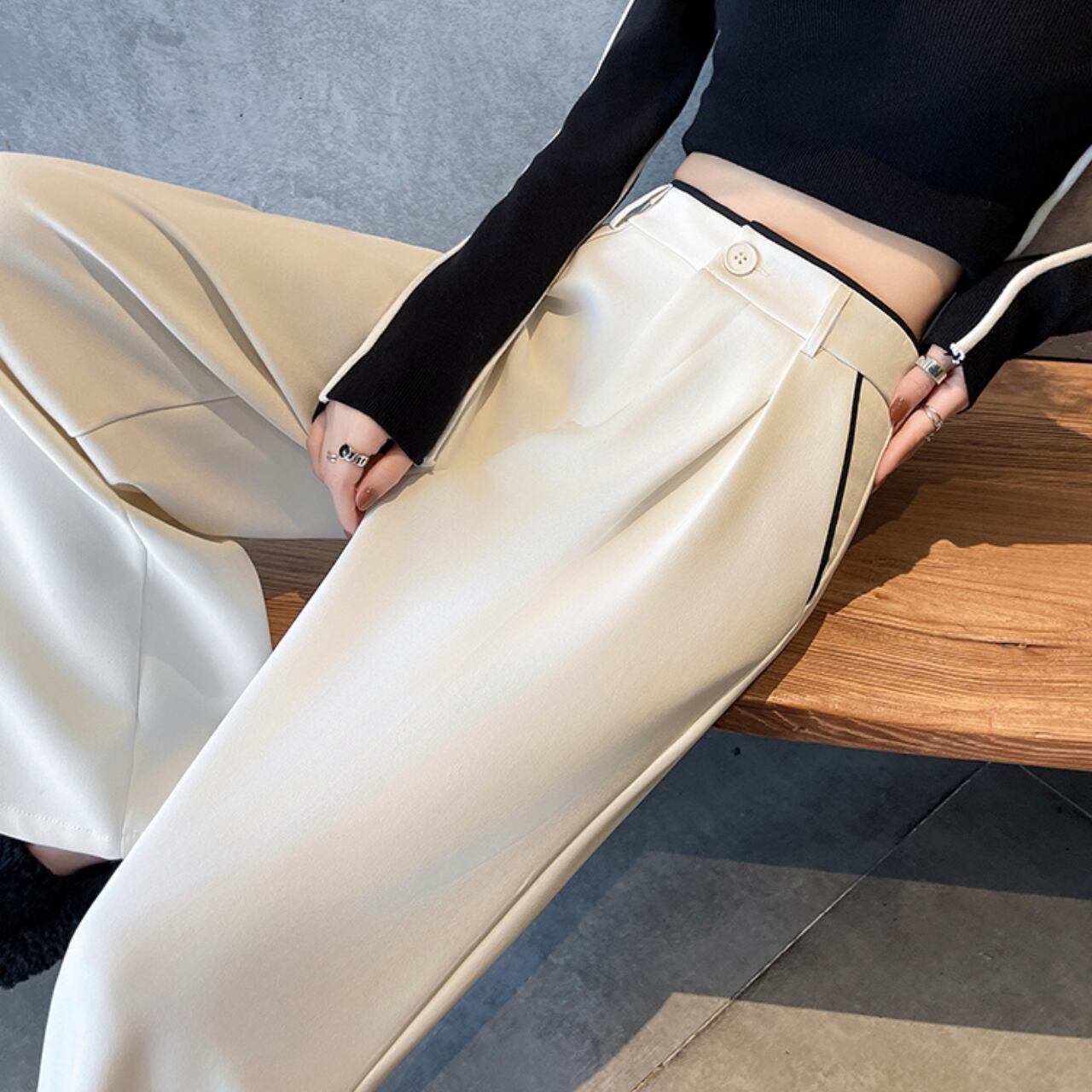 ハイウエストデザインでスタイルアップ効果も期待できます。センタープレスでより洗練された印象に。