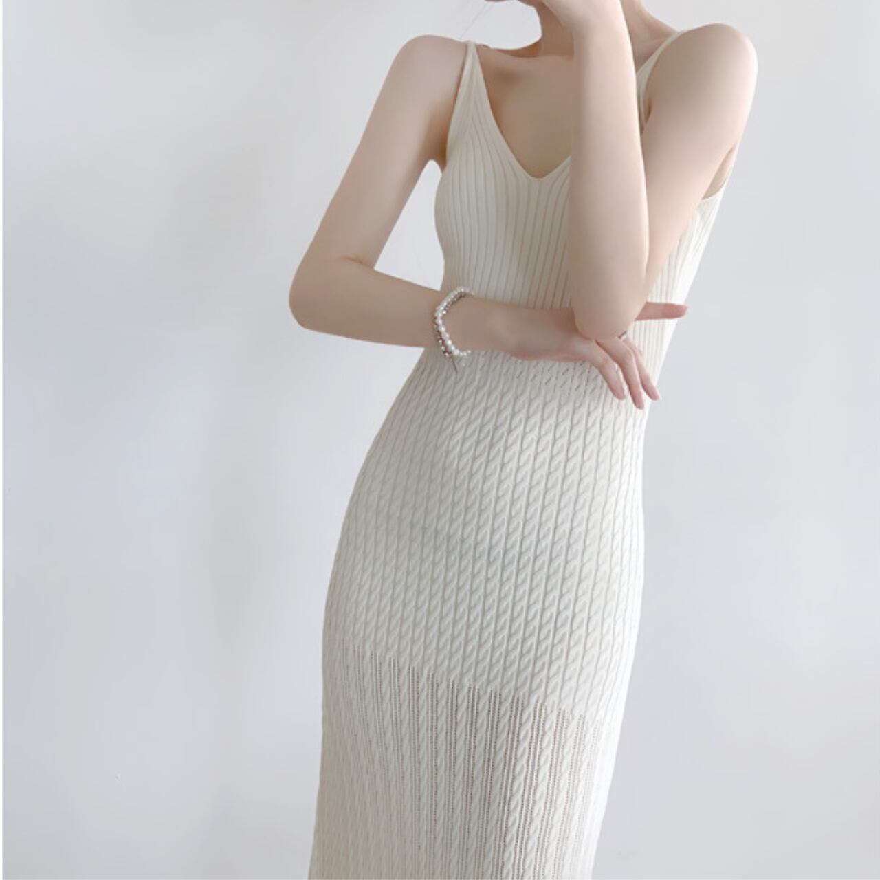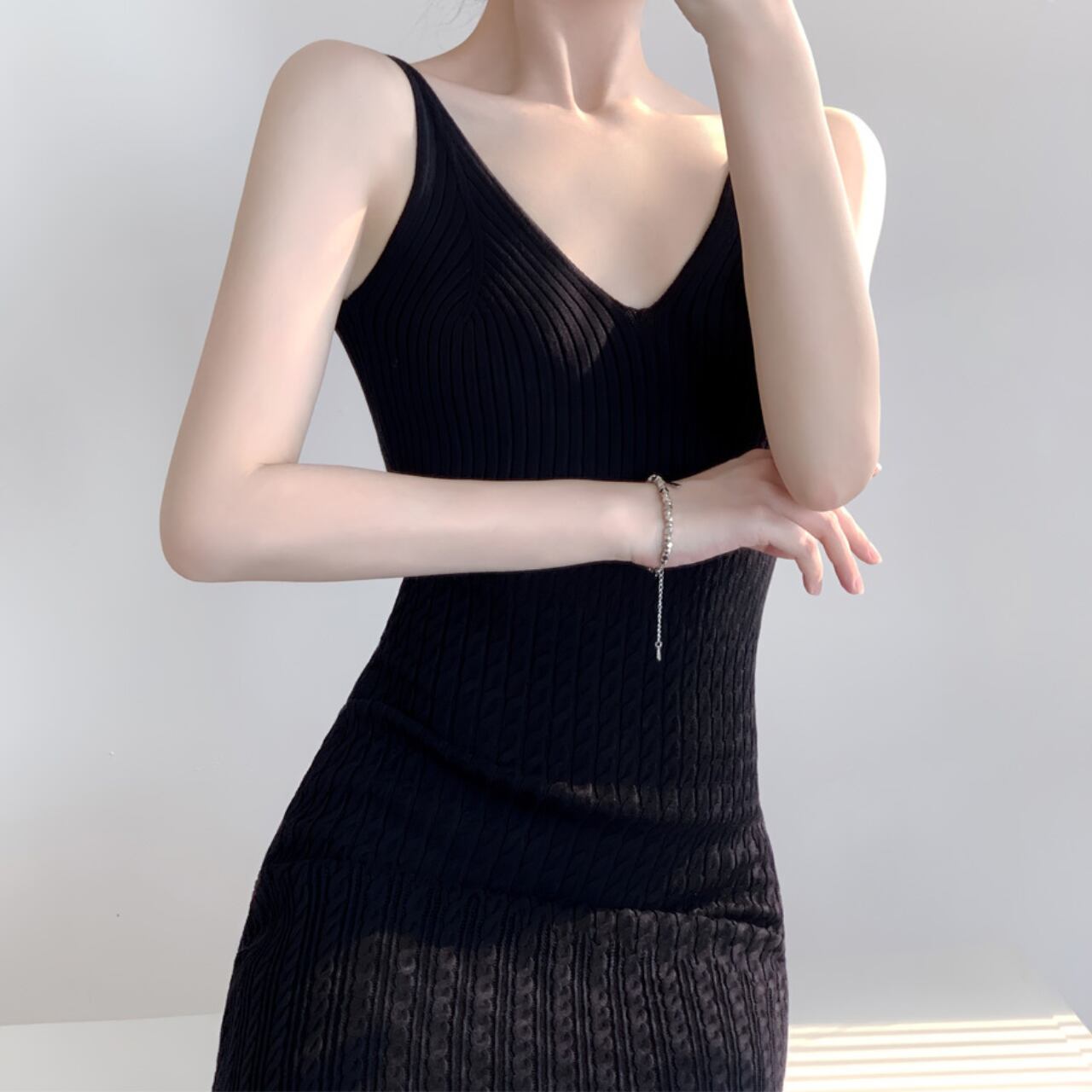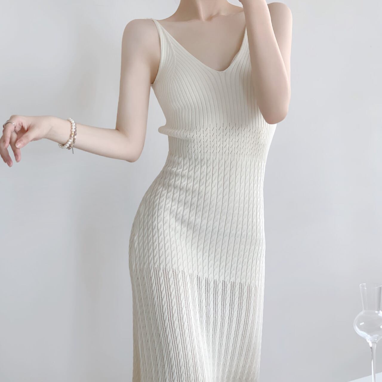 Vネックキャミソールリブニットロングワンピース W00021