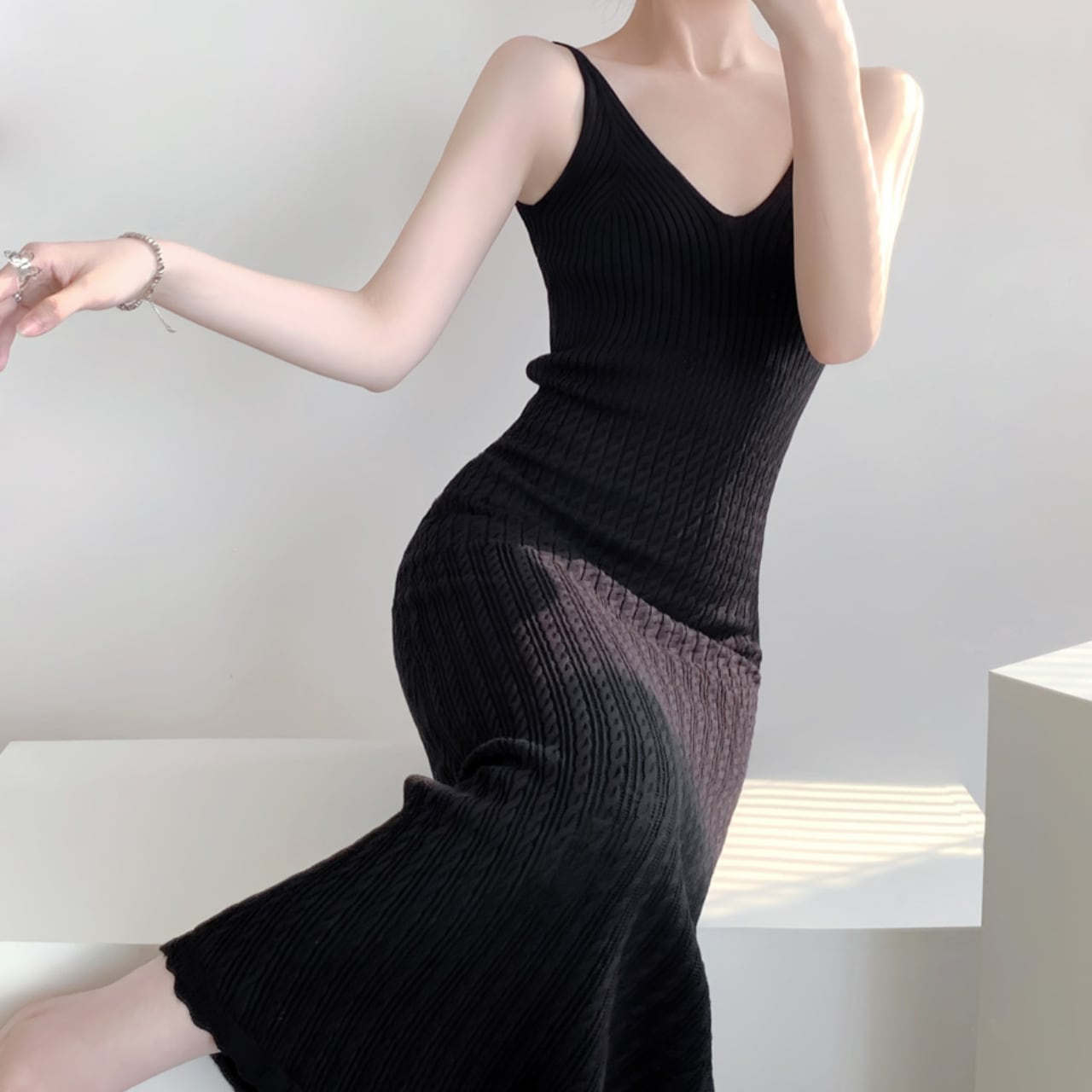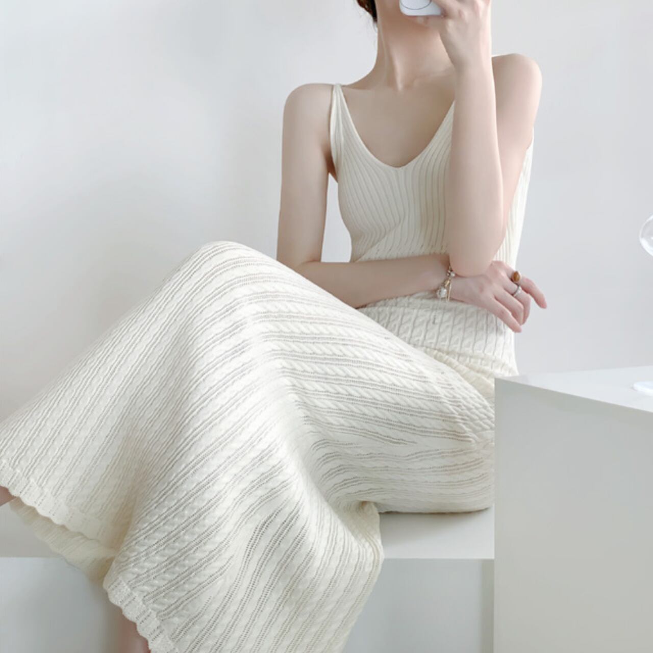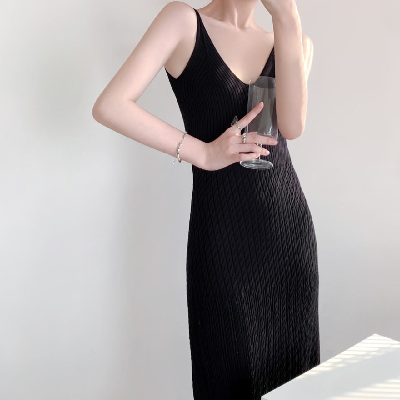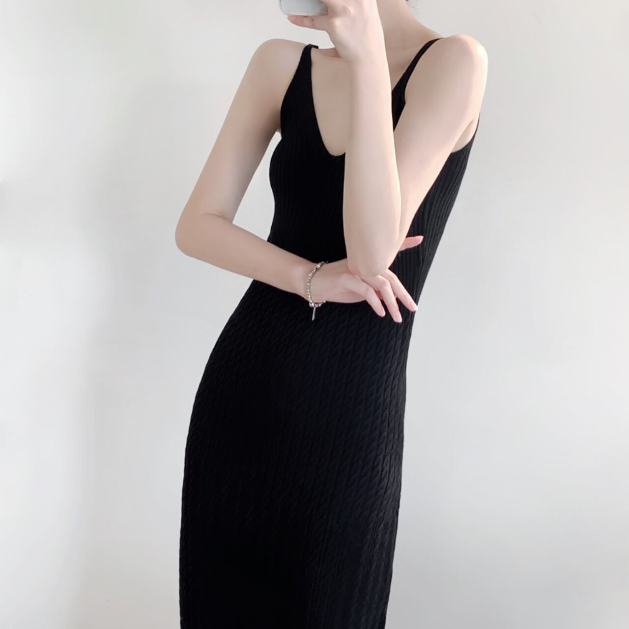 Vネックキャミソールリブニットロングワンピース W00021