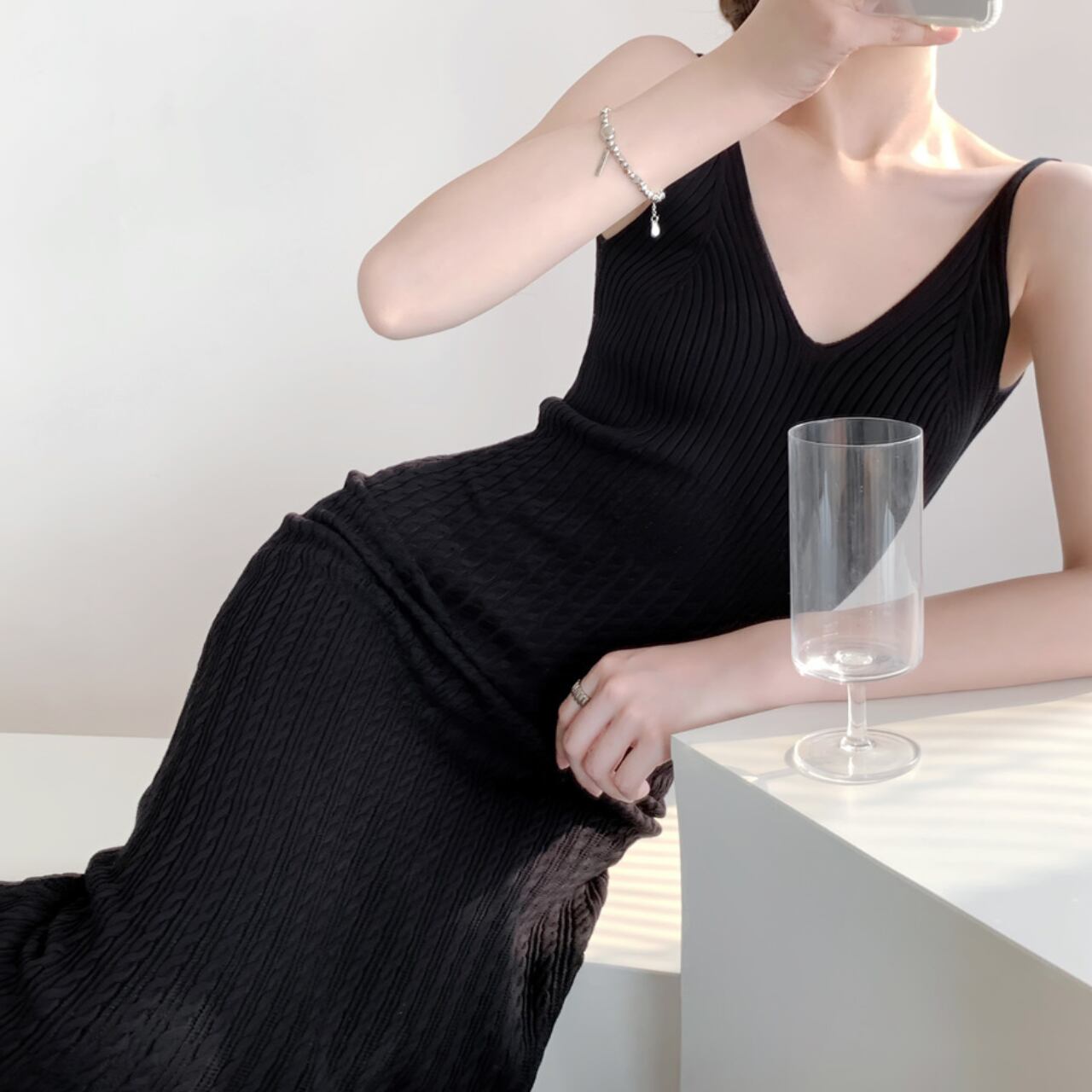 しなやかなラインを美しく引き立てる、リブニットロングワンピース。