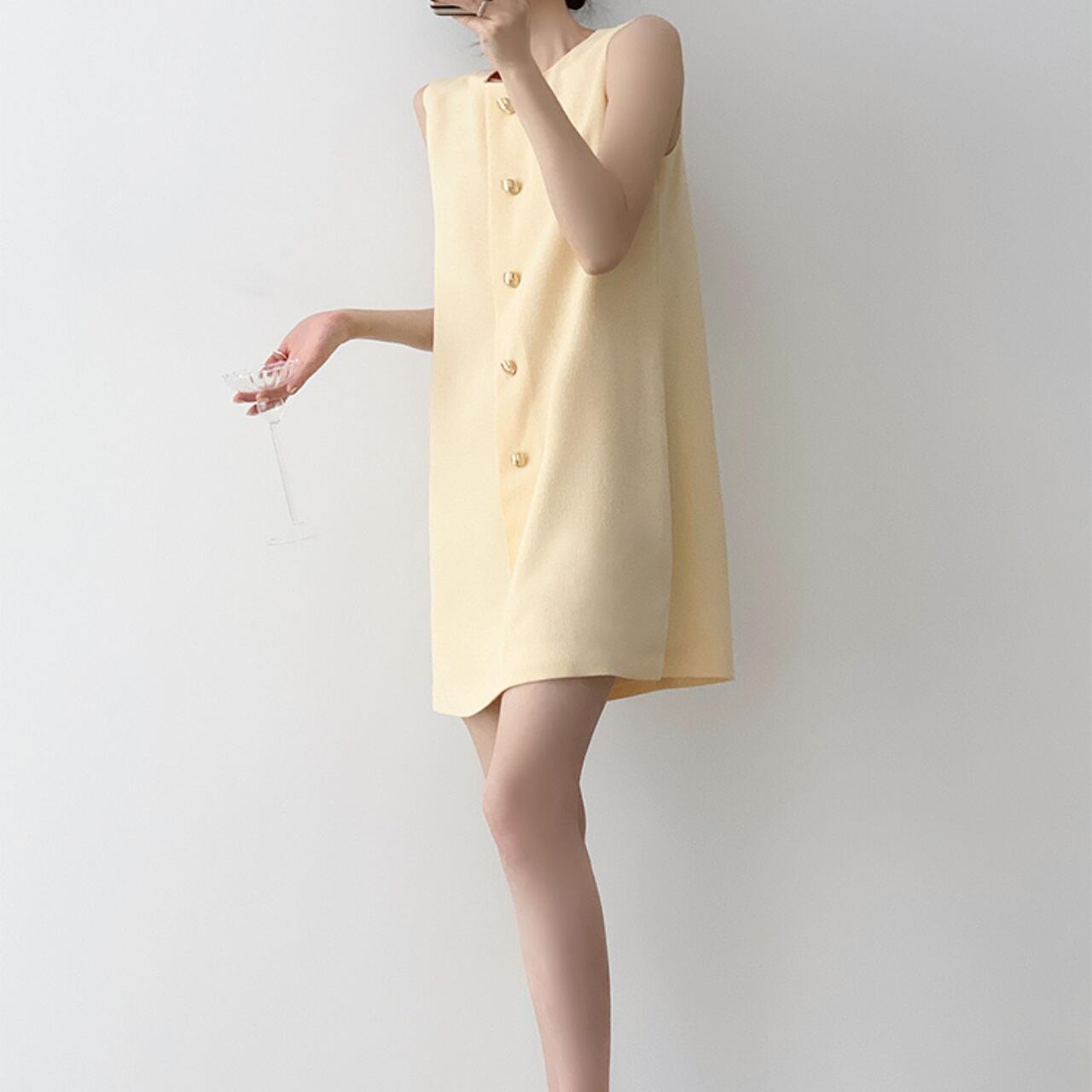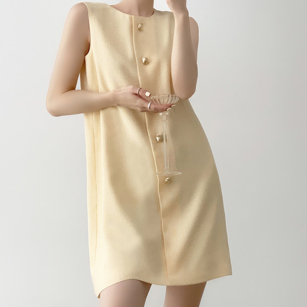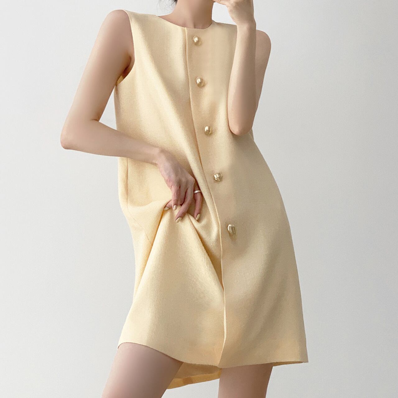 エレガントな光沢を放つメタリックボタンがアクセントの、ノースリーブAラインワンピース。軽やかなライトイエローカラーが肌を明るく見せ、ミニマルなデザインが洗練された印象に。しっかりとした生地感で1枚でも着映えし、アクセサリーいらずの高見えスタイルが完成。デートやお呼ばれにもぴったりな、上品な大人の一着です。