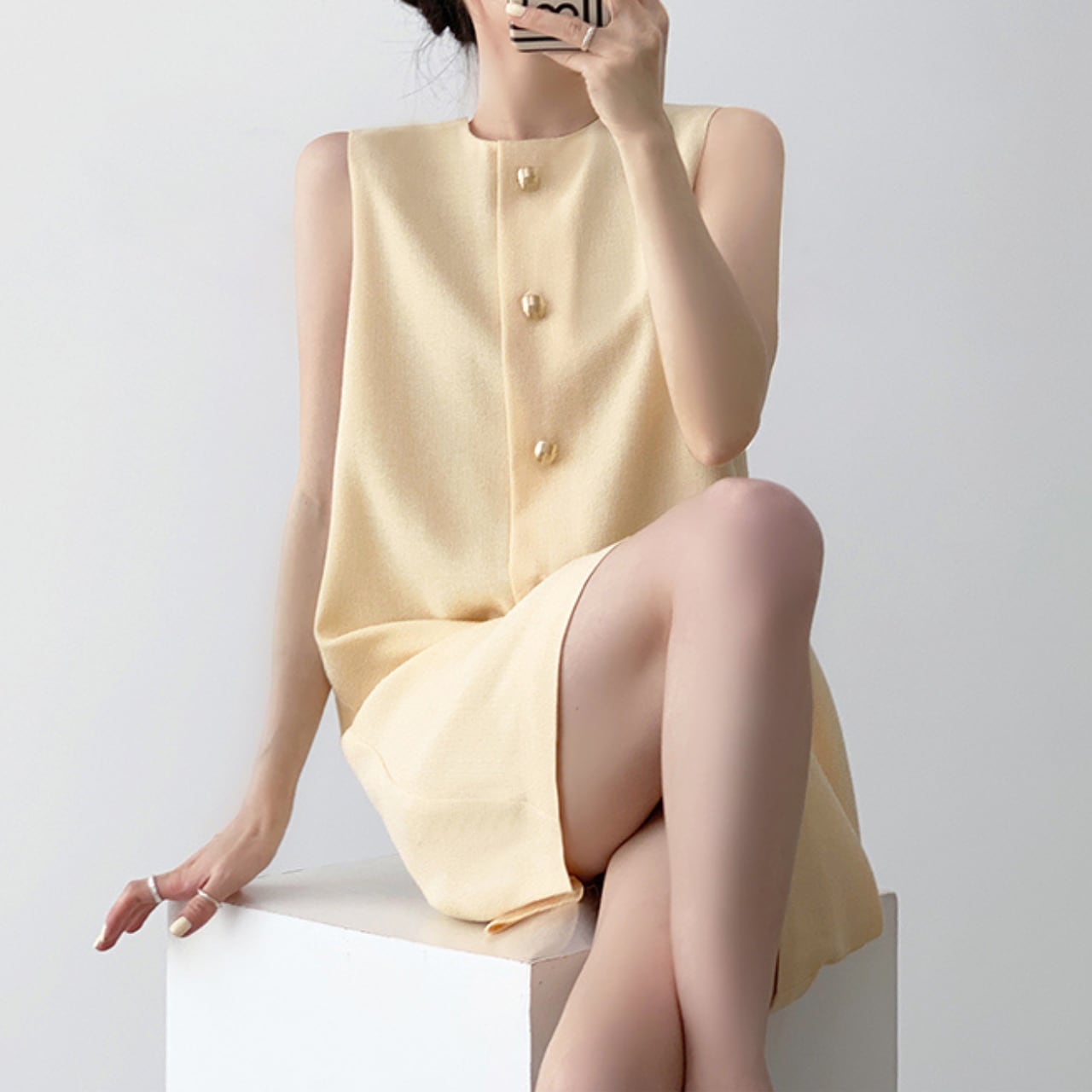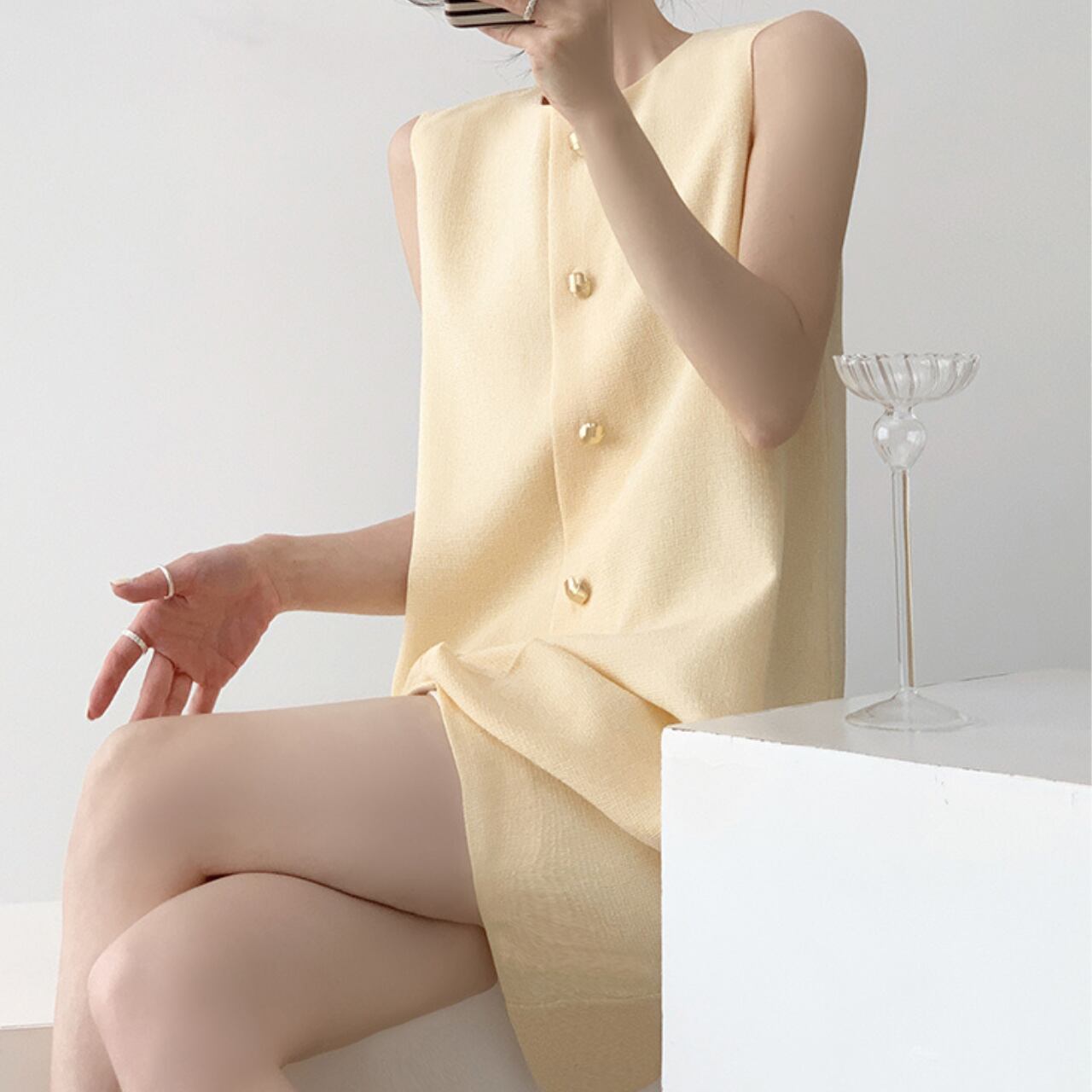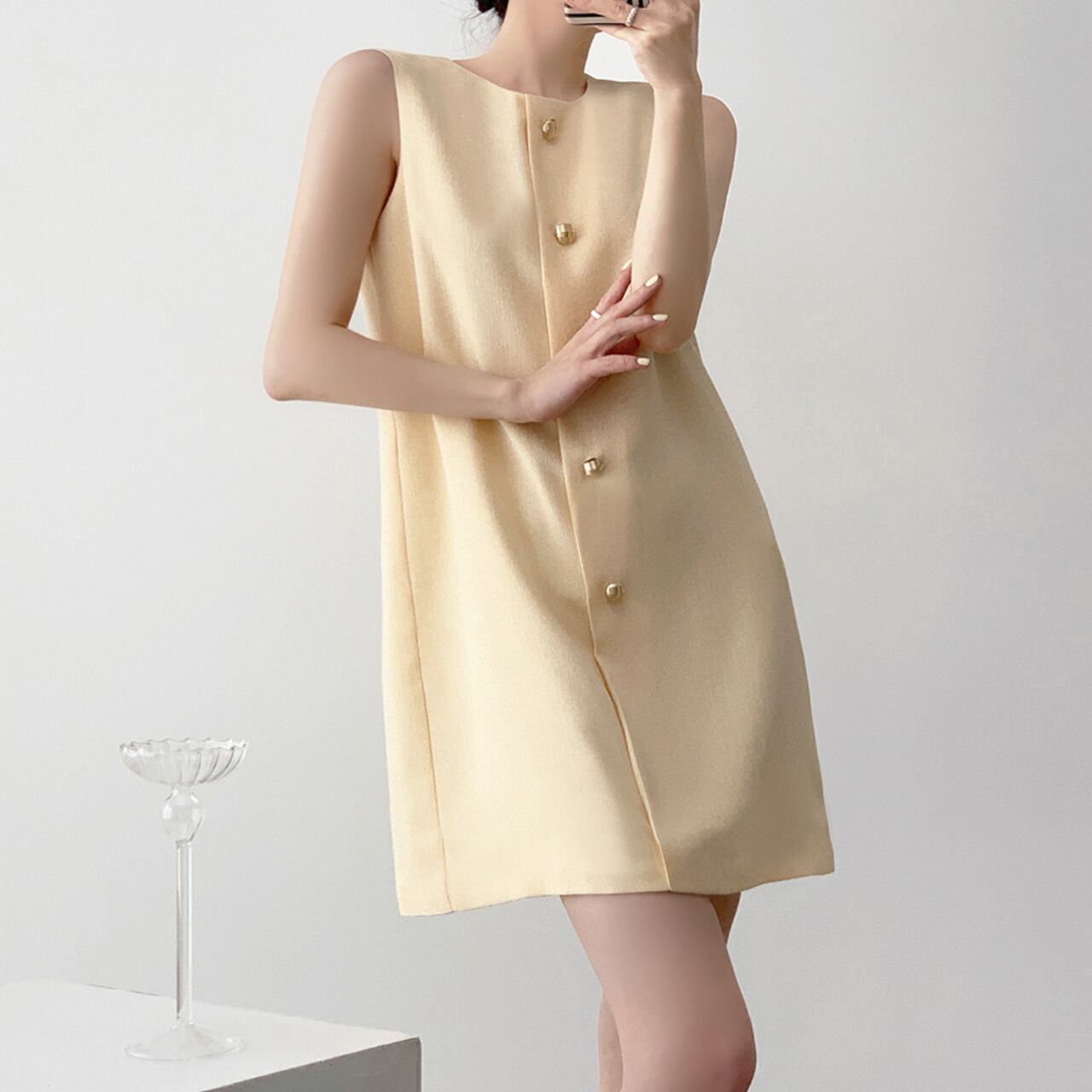 エレガントな光沢を放つメタリックボタンがアクセントの、ノースリーブAラインワンピース。軽やかなライトイエローカラーが肌を明るく見せ、ミニマルなデザインが洗練された印象に。しっかりとした生地感で1枚でも着映えし、アクセサリーいらずの高見えスタイルが完成。デートやお呼ばれにもぴったりな、上品な大人の一着です。